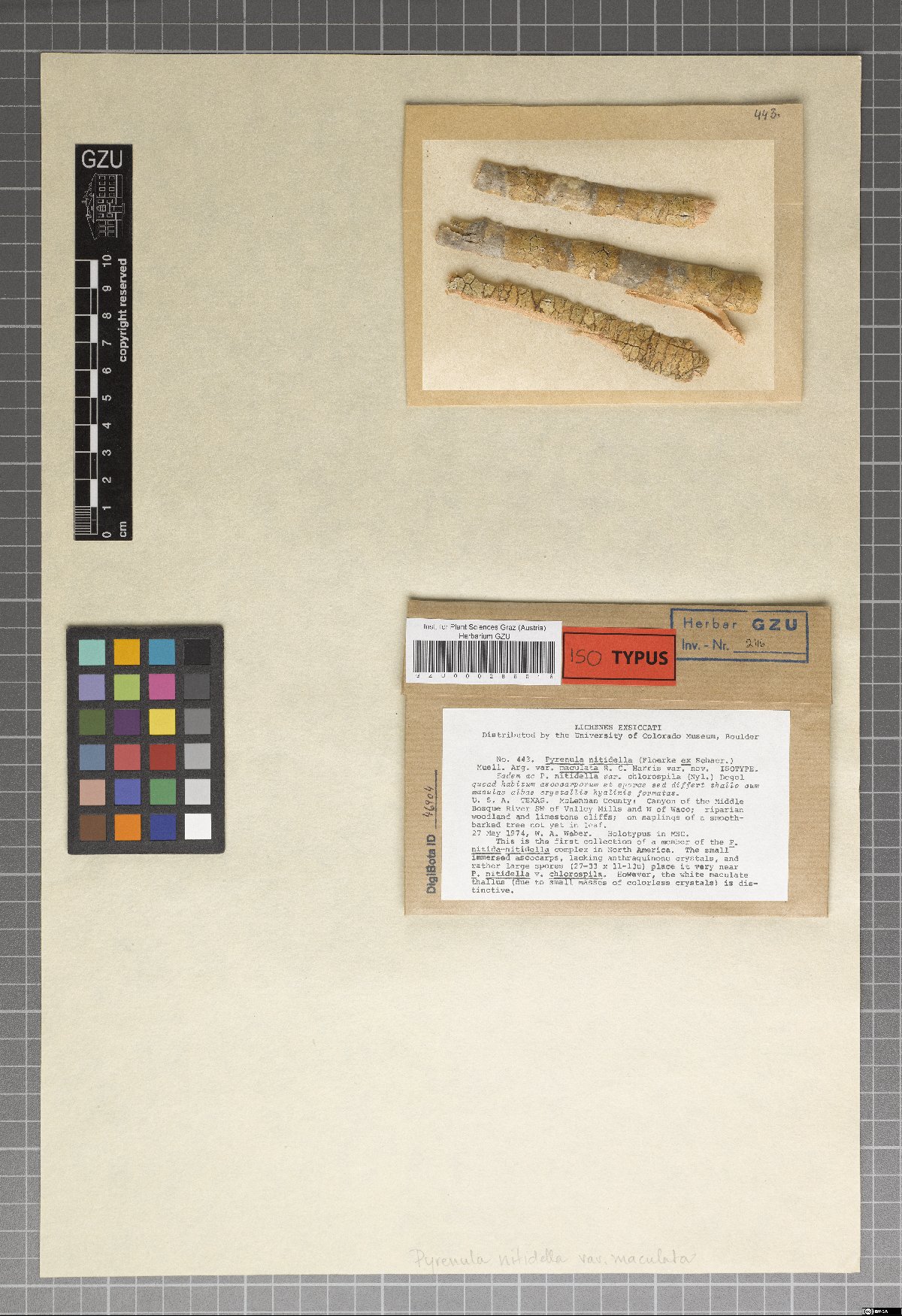 Weber,W.A. s.n. [1974-05-27] Weber, Lichenes exsiccati distributed by the University of Colorado Museum, Boulder (Colorado) 443 |